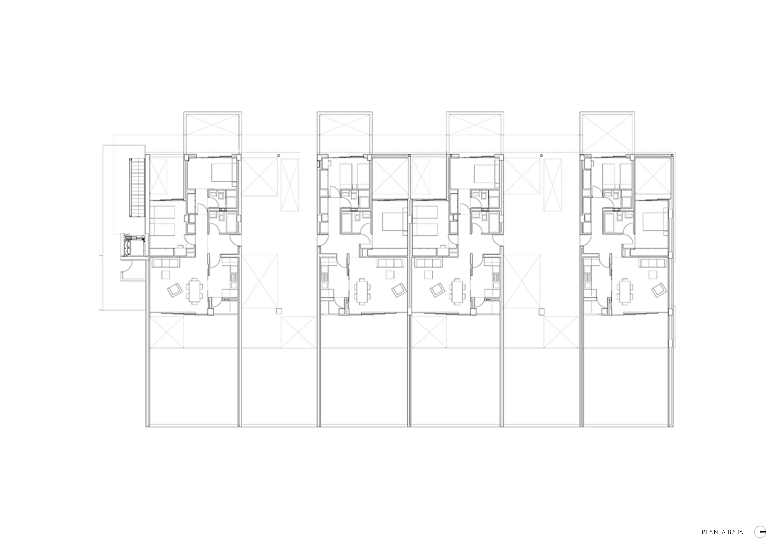 Es por ello que se procede a la agrupación de elementos opacos y a la disposición de elementos transparentes que permitan conectar visualmente el interior y exterior de la urbanización a través de la propia edificación. Del mismo modo, se prevén en planta baja amplios pasos libres que permitan el paso al interior de la parcela y la visión sobre el campo de golf para los usuarios de los viales perimetrales de la urbanización. Por ello, el alzado de la agrupación se convierte en una ordenación de elementos transparentes y opacos en el que la composición volumétrica trata de dotar al conjunto de una escala menor y más acorde al entorno en el que se sitúa.