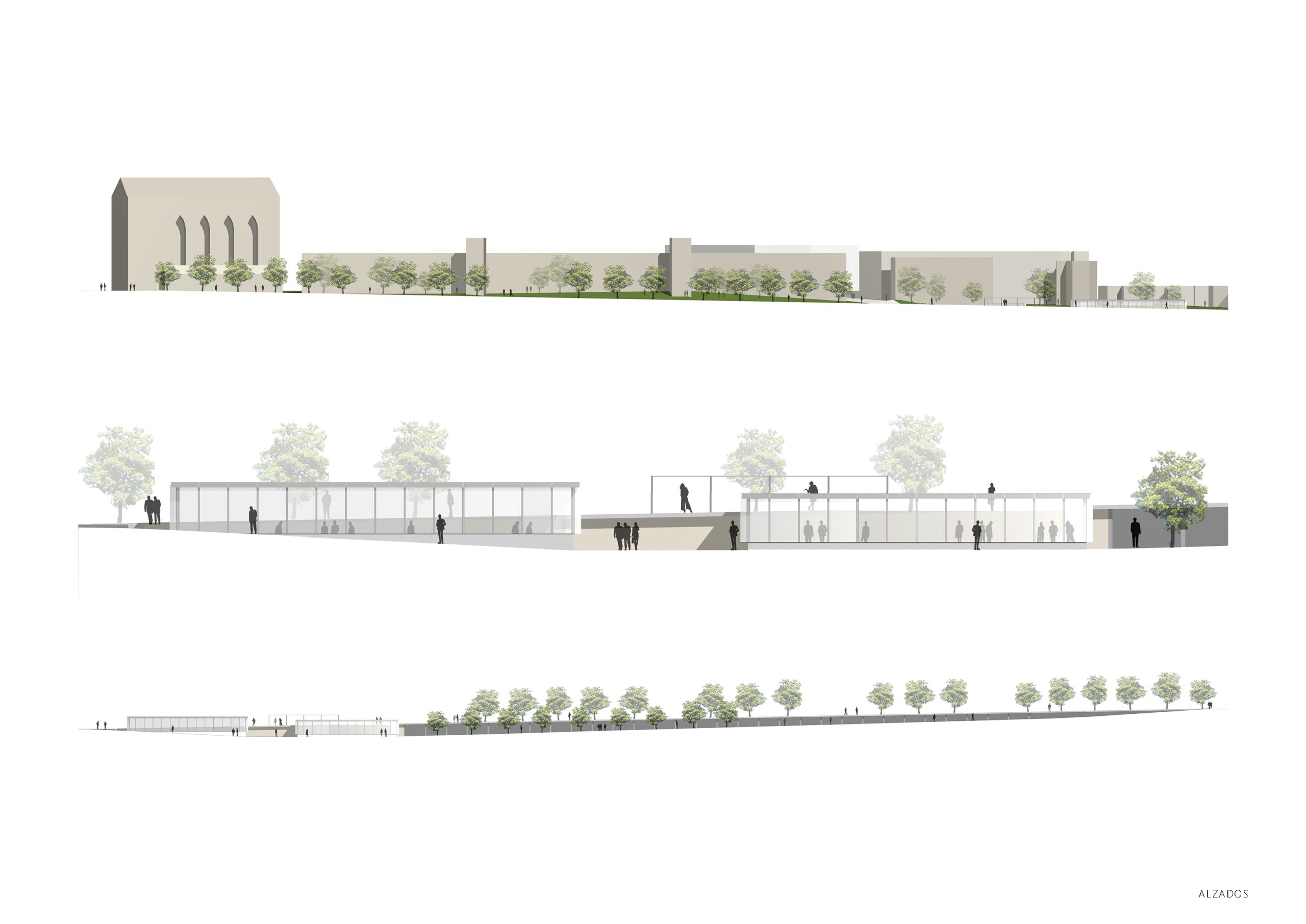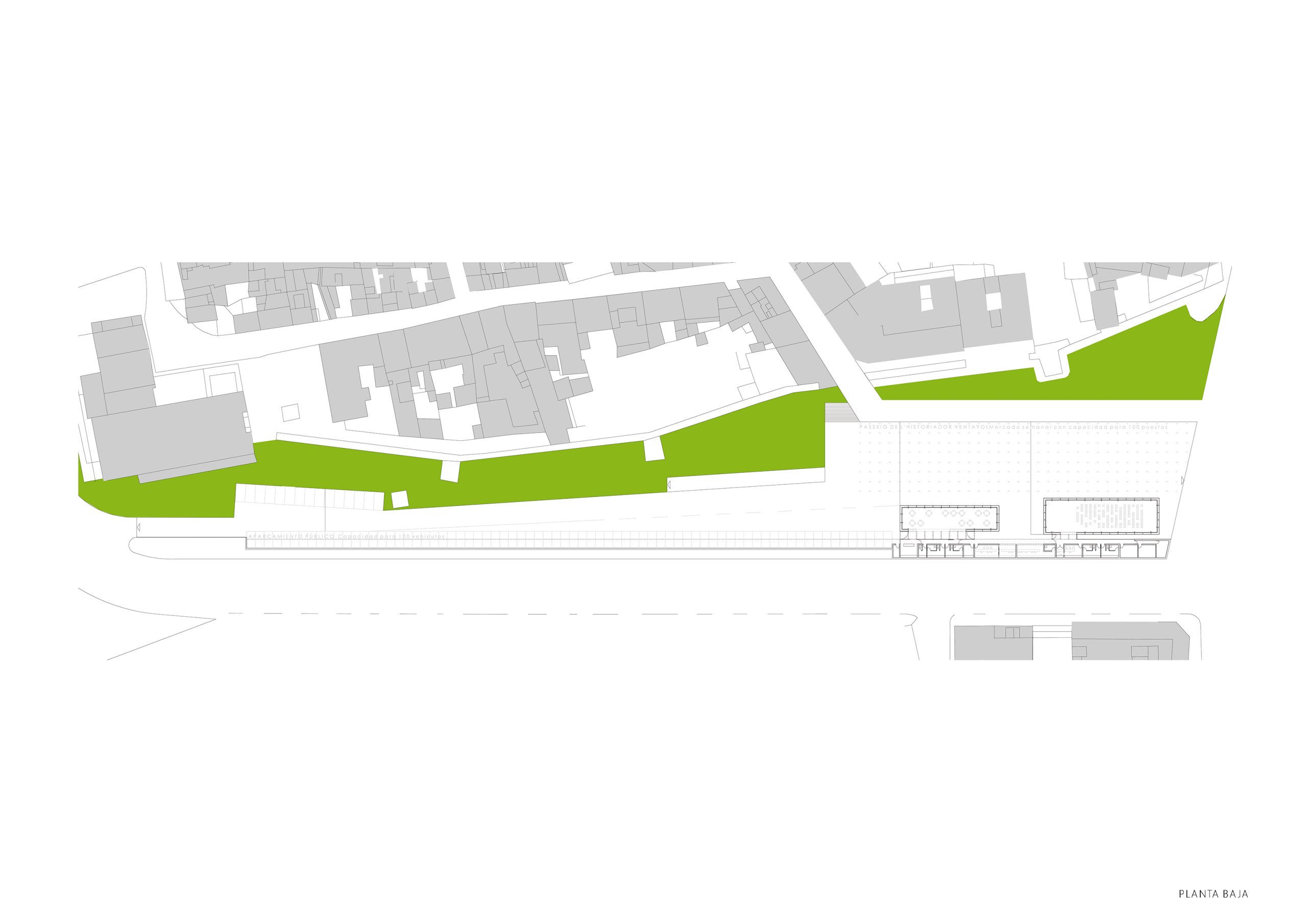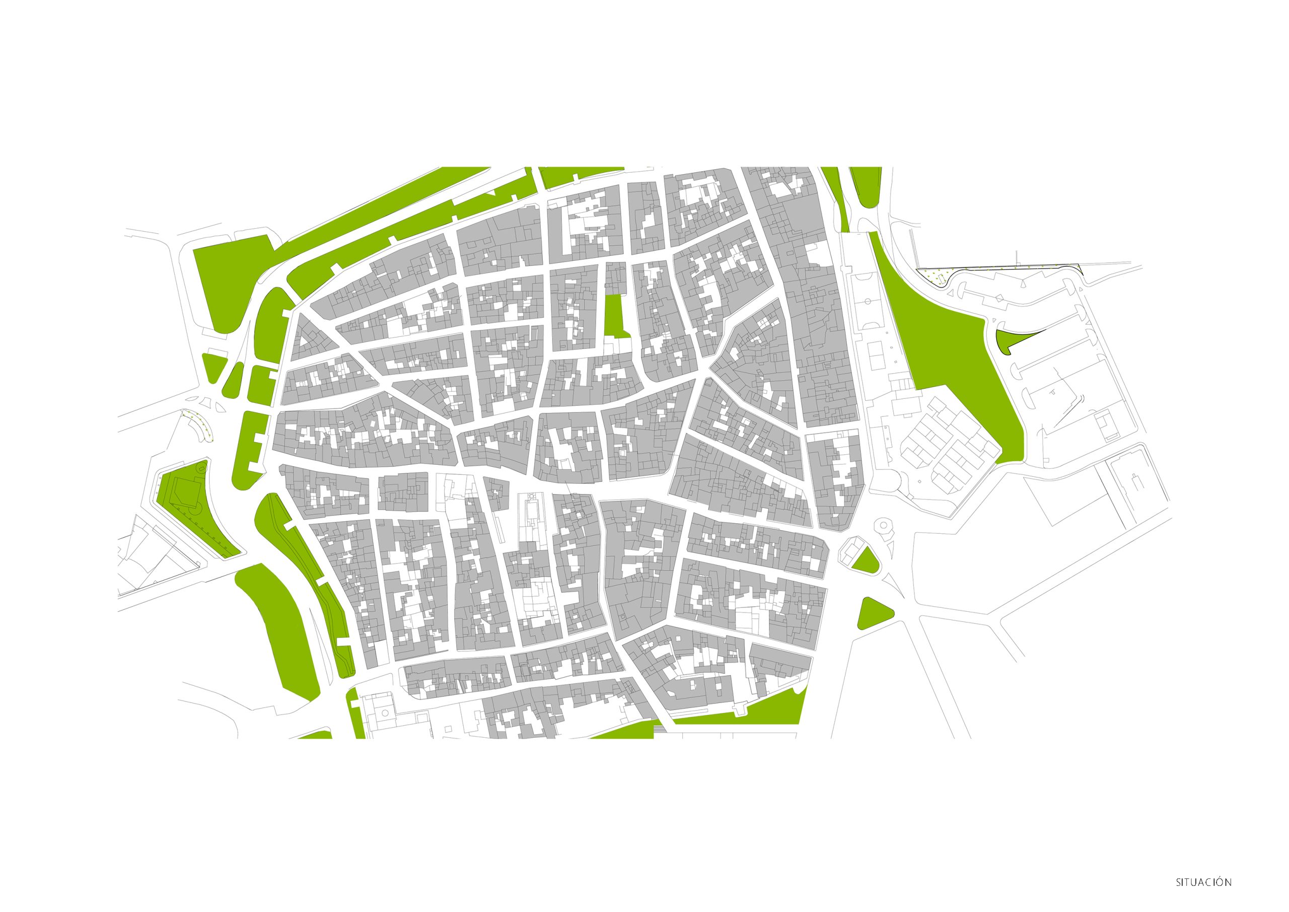La gran cantidad de vehículos estacionados sin ningún orden en la zona objeto de intervención distorsionan la imagen de un elemento arquitectónico de gran valor histórico, como es la antigua muralla de la ciudad. Por ello se propone la depresión de una franja de terreno situada frente a ella, de modo que se genere, a un nivel inferior y por tanto oculto desde la calle, un aparcamiento cubierto parcialmente y de gran capacidad. Al mismo tiempo se propone la disposición de un espacio ajardinado que distancie al tráfico rodado de la antigua muralla y dé continuidad a las zonas ajardinadas que la acompañan en los demás tramos todavía conservados, completando así un cinturón verde que rodea a la parte antigua de la ciudad.